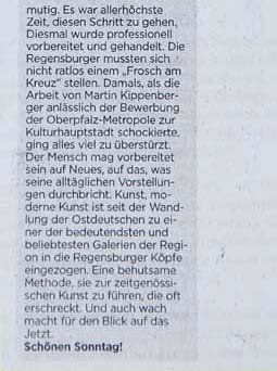 „Ein Ja ist ein Ja und ein Nein ist ein Nein, alles andere ist von Übel“; so zitierte Pater Friedhelm Mennekes gegenüber Kulturjournal Regensburg aus dem Brief des Jakobus ... Stellung beziehen und Haltung zeigen, das sei das Wesen der Kunst und gerade in einer Zeit der zunehmenden Nivellierung so nötig wie noch nie ... „Der katholische Faktor“ fordert ebenso zu Fragen und Antworten auf. Fragen, die jeder an sich selbst stellt, an die Gesellschaft, an die Kirche ..." Michael Krol, KJ, 5.04.2009